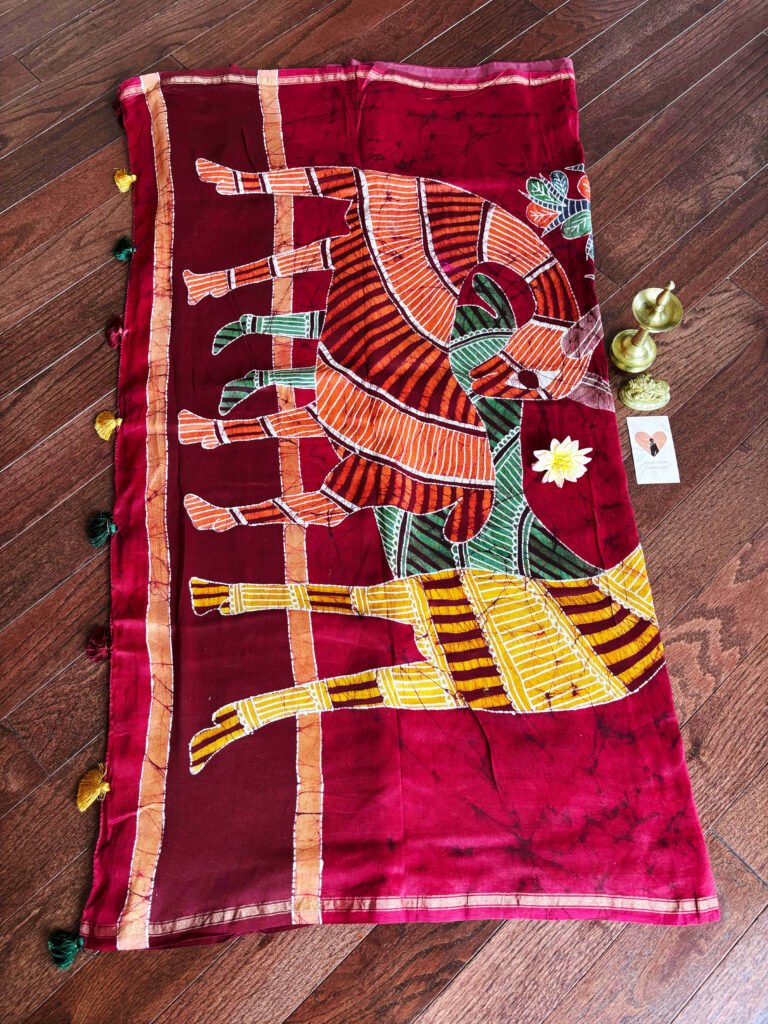 A Chanderi silk saree is a traditional, lightweight, and elegant Indian saree known for its sheer, slightly translucent fabric and intricate patterns woven with silk, cotton, and gold or silver (zari) threads. Originating from the town of Chanderi in Madhya Pradesh, India, these handloom sarees feature motifs inspired by nature, such as flowers, peacocks, and gold coins. They are prized for their luxurious feel, subtle sheen, and comfortable, airy texture, making them a popular choice for formal occasions and festivals.