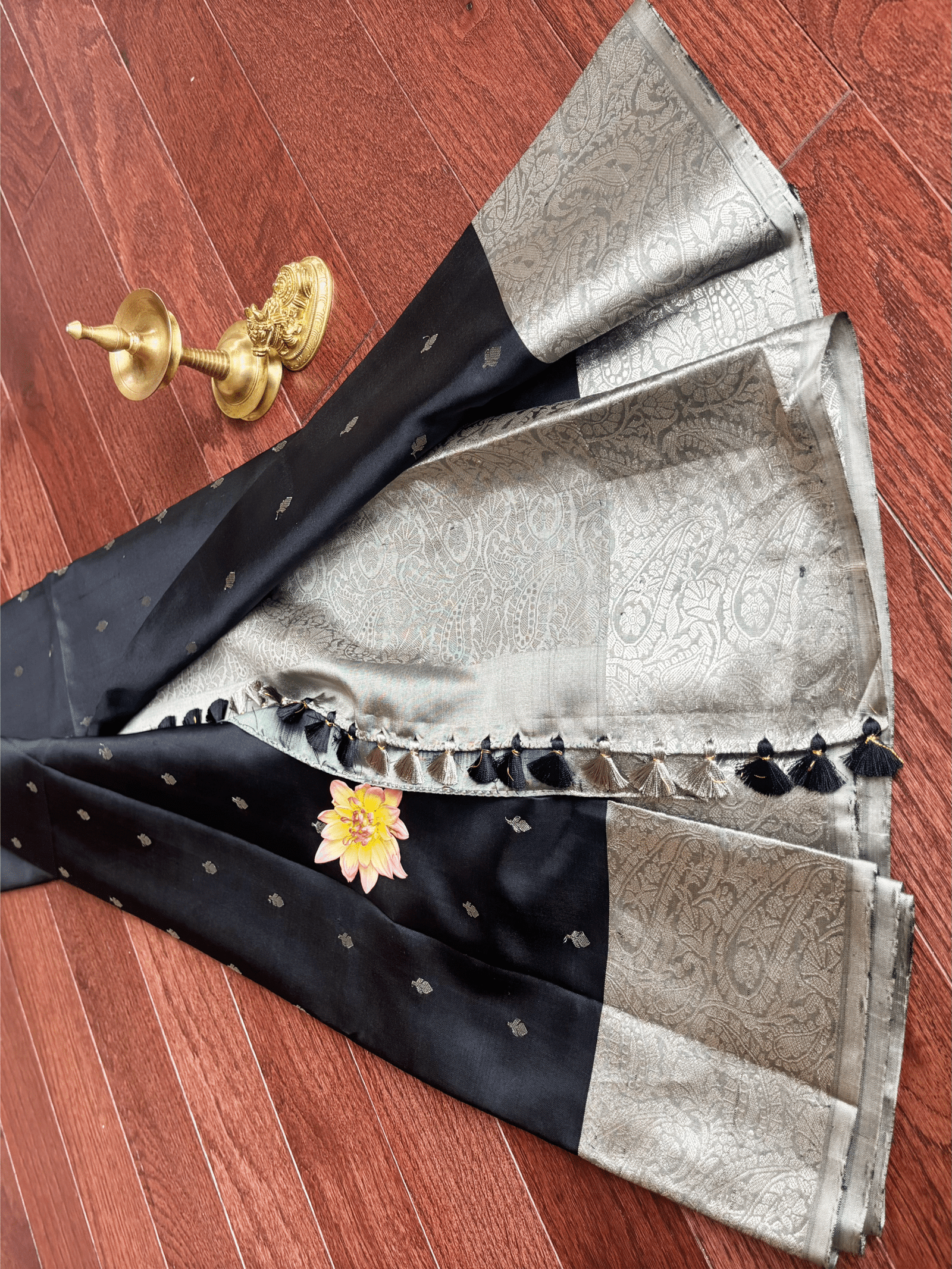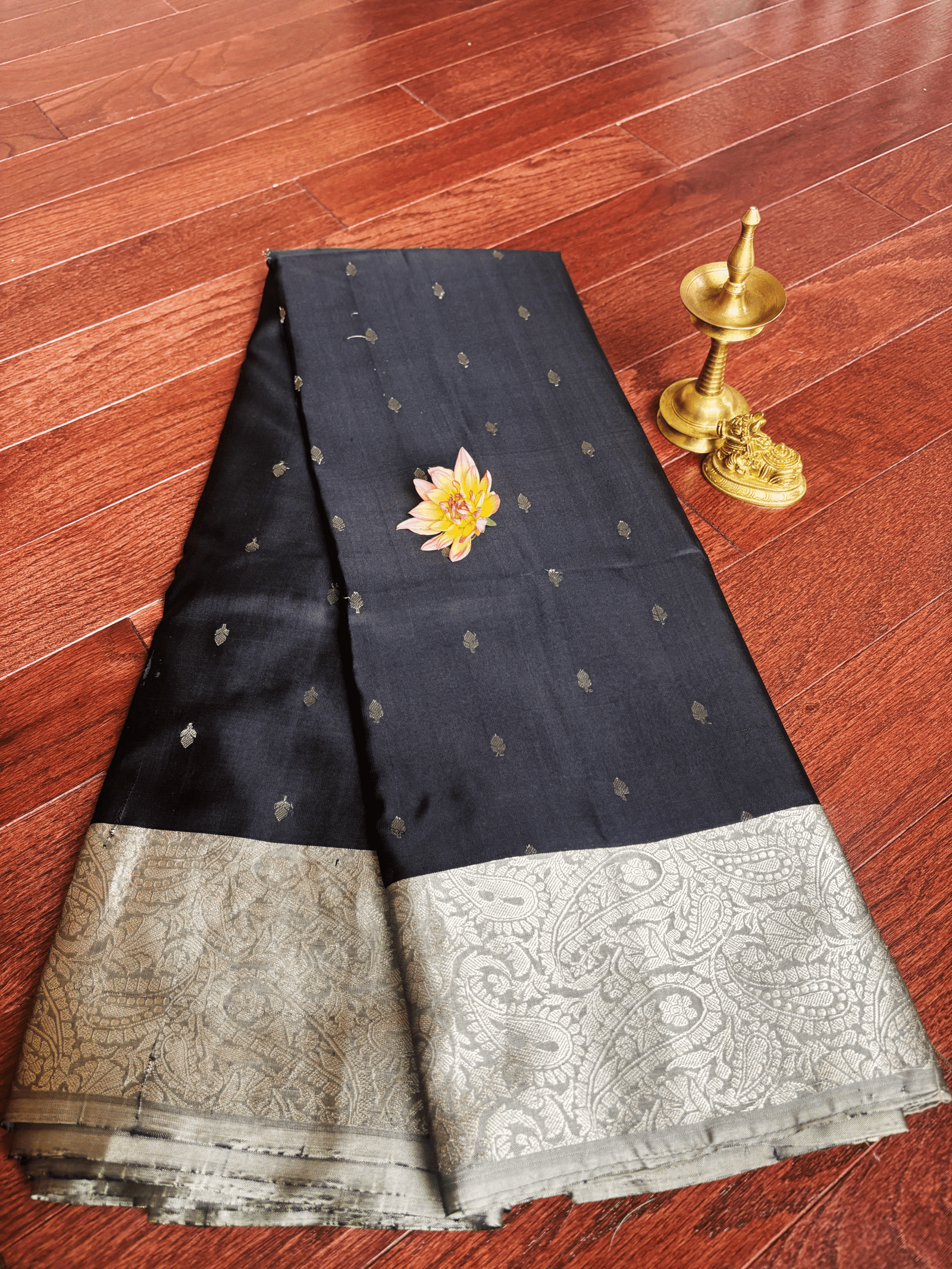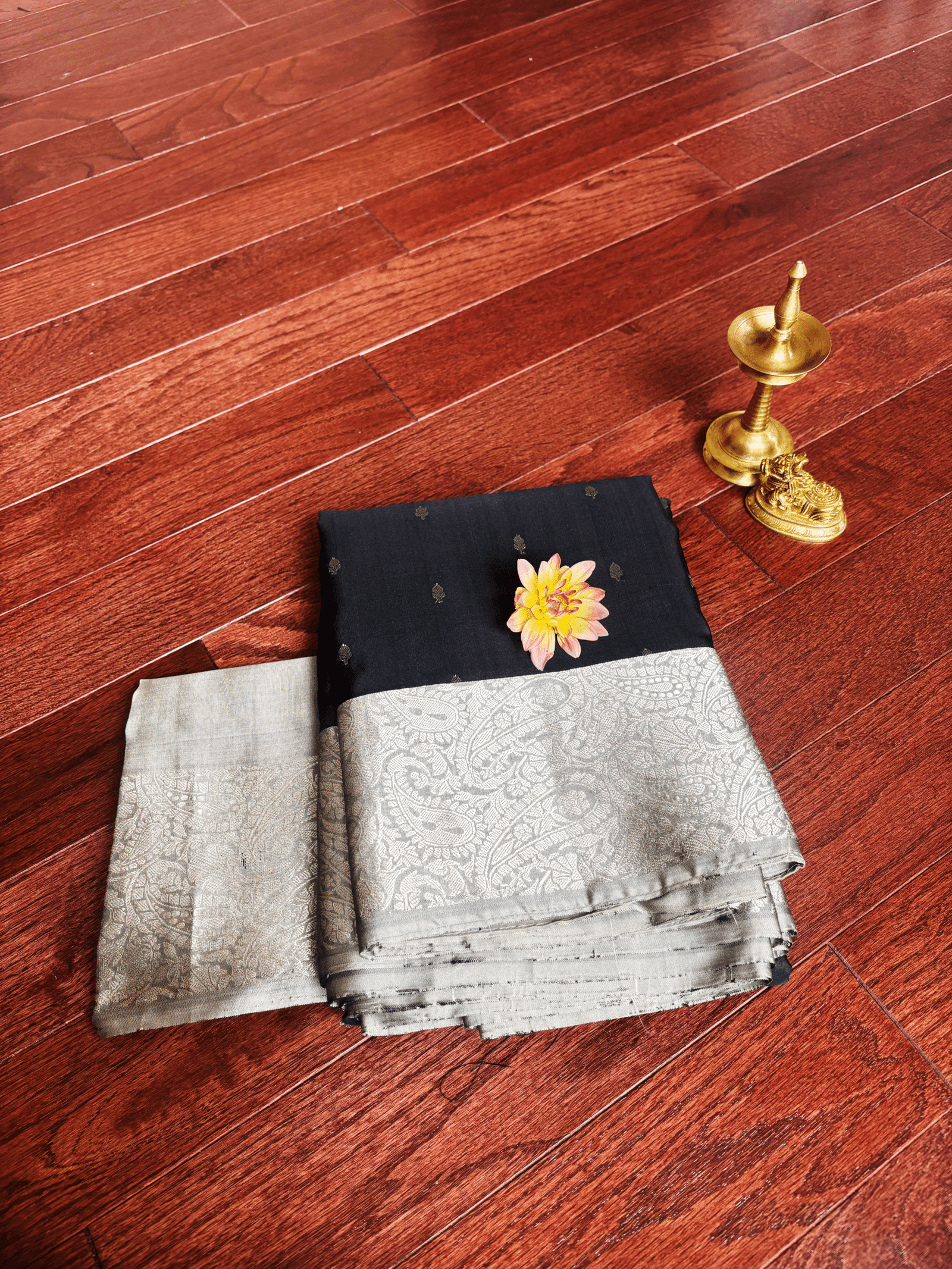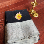 This is a beautiful Kanjeevaram pure silk saree from Heartifacts’ collections. Sporting a silver grey border and buttis all over, this versatile saree comes with a silver blouse. Every woman’s saree collection deserves a classy, classic black silk saree. This is a great staple saree for a variety of events, from the casual pot luck dinner to a more exclusive soiree. Don’t miss out on this chance to get this saree at cost price with our website launch sale!