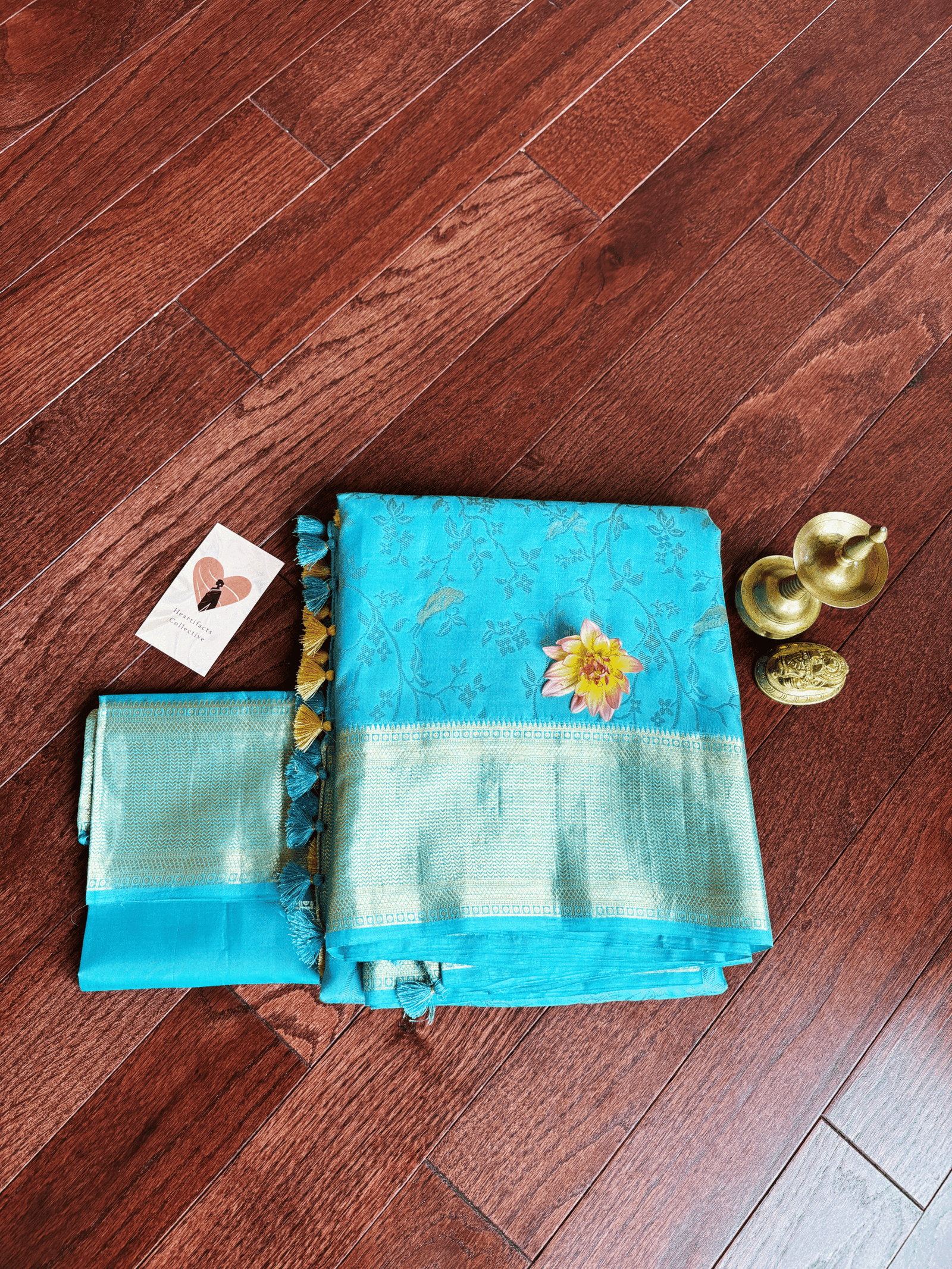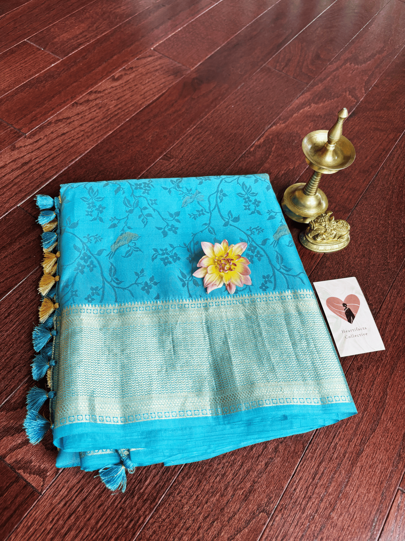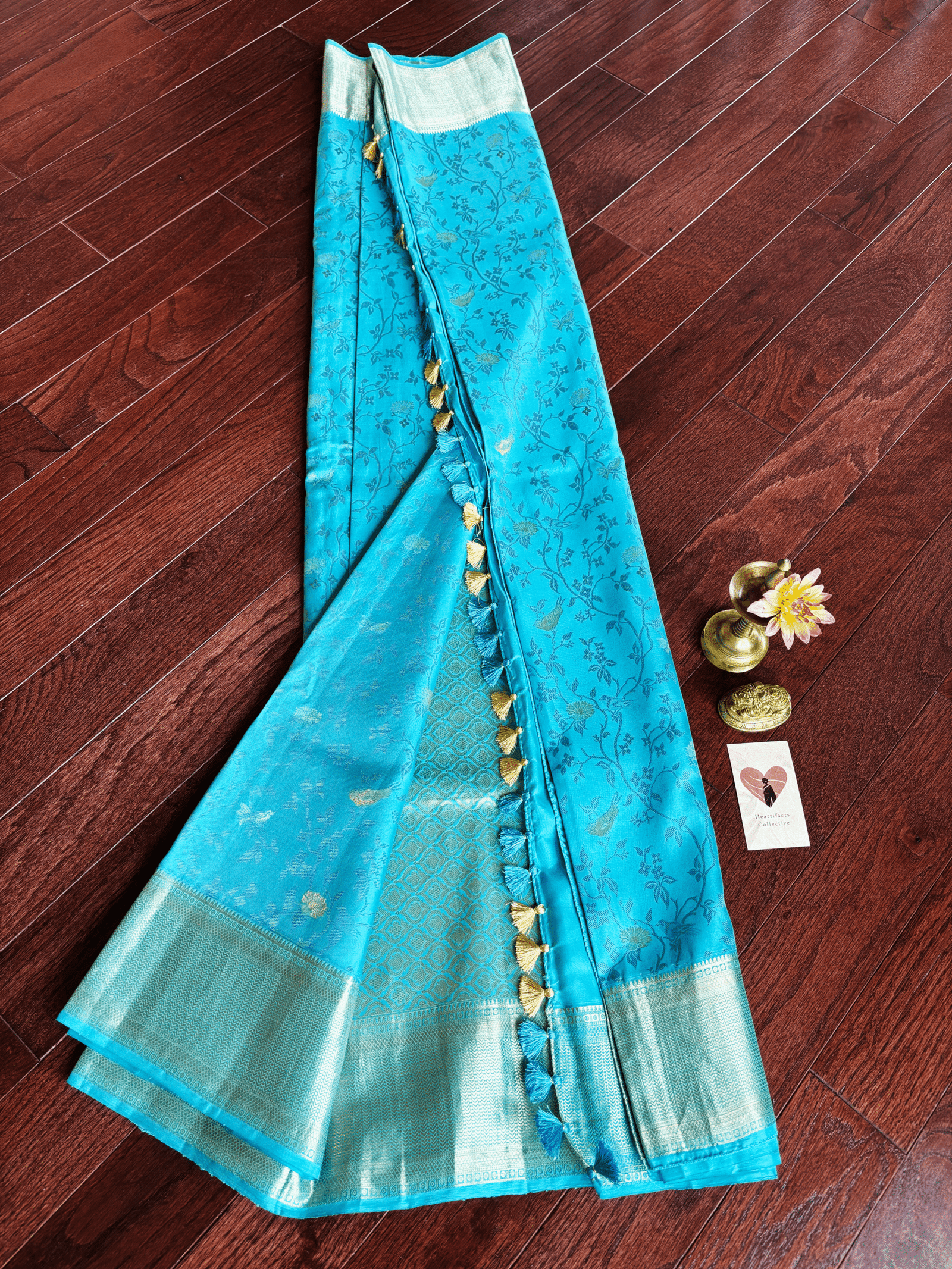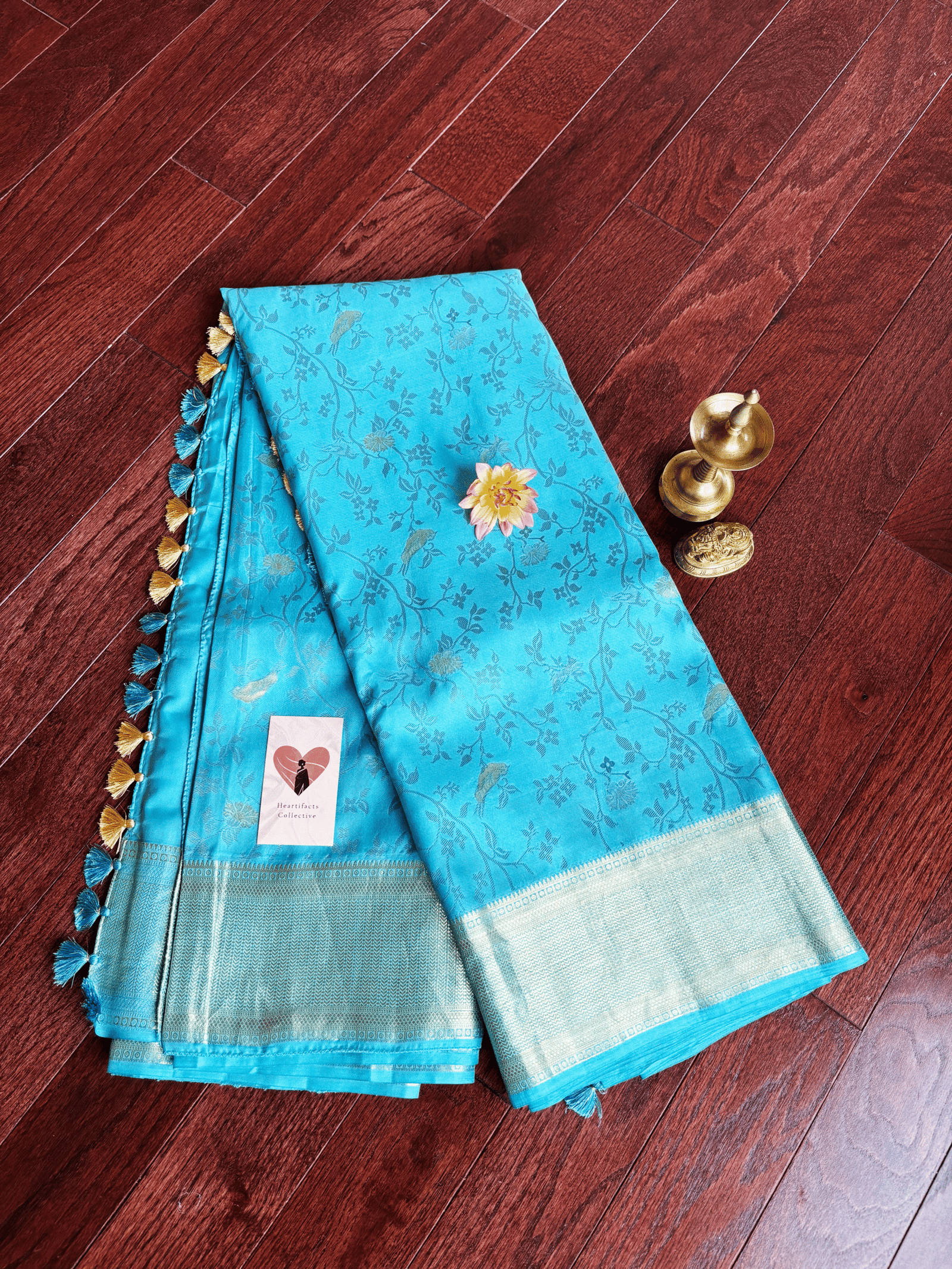 The bird motifs on this powder blue Kanjeevaram silk saree are exotic and add a unique touch to the classic floral vine motifs. Sporting a pure zari with a geometric pallu design, the bright and punchy colour stands out. Under bright light, this saree truly gleams and makes it hard to look away.