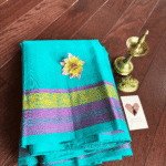 This simple Kanjeevaram thread silk saree with zero zari and beautiful threadwork on the border shows that sarees do not need to be complex and busy to be beautiful. The simplicity allows the absolutely gorgeous shade of turquoise to stand out. Pictures do not do this one justice. The purple pallu and tassels enhance the main colour, making for a truly simple but classic and elegant piece.