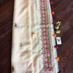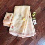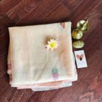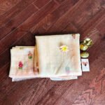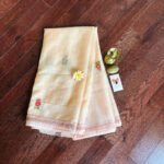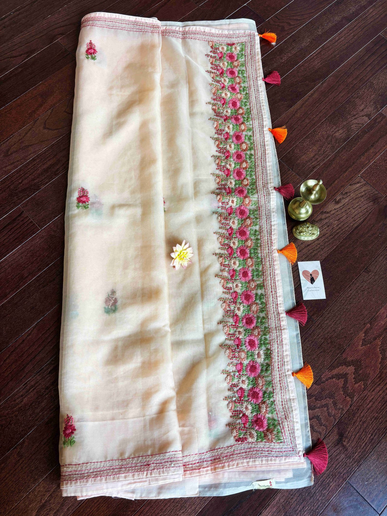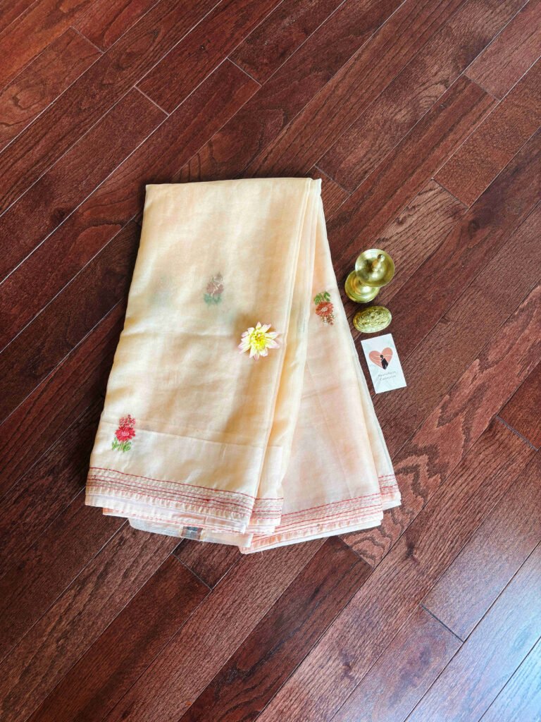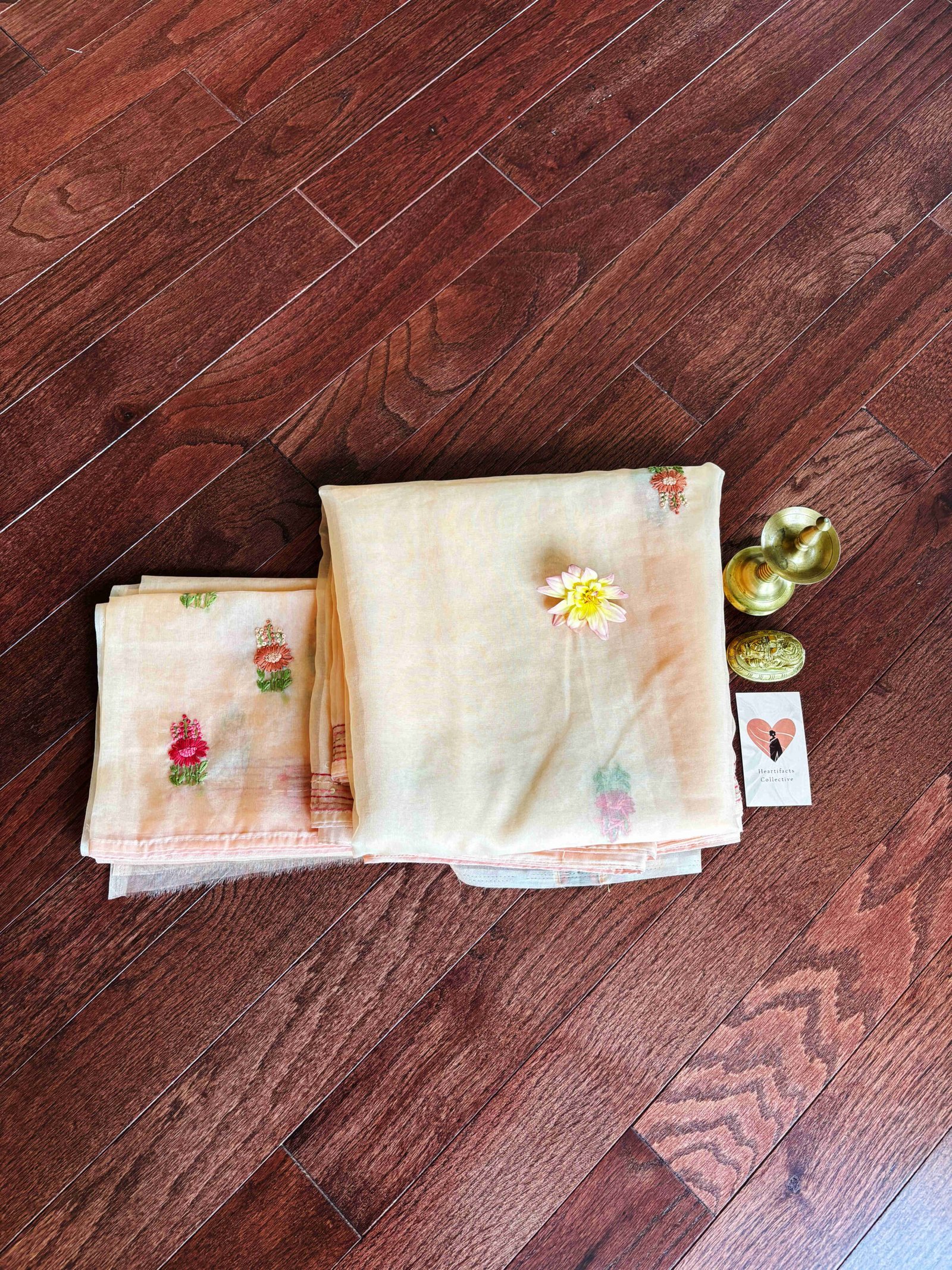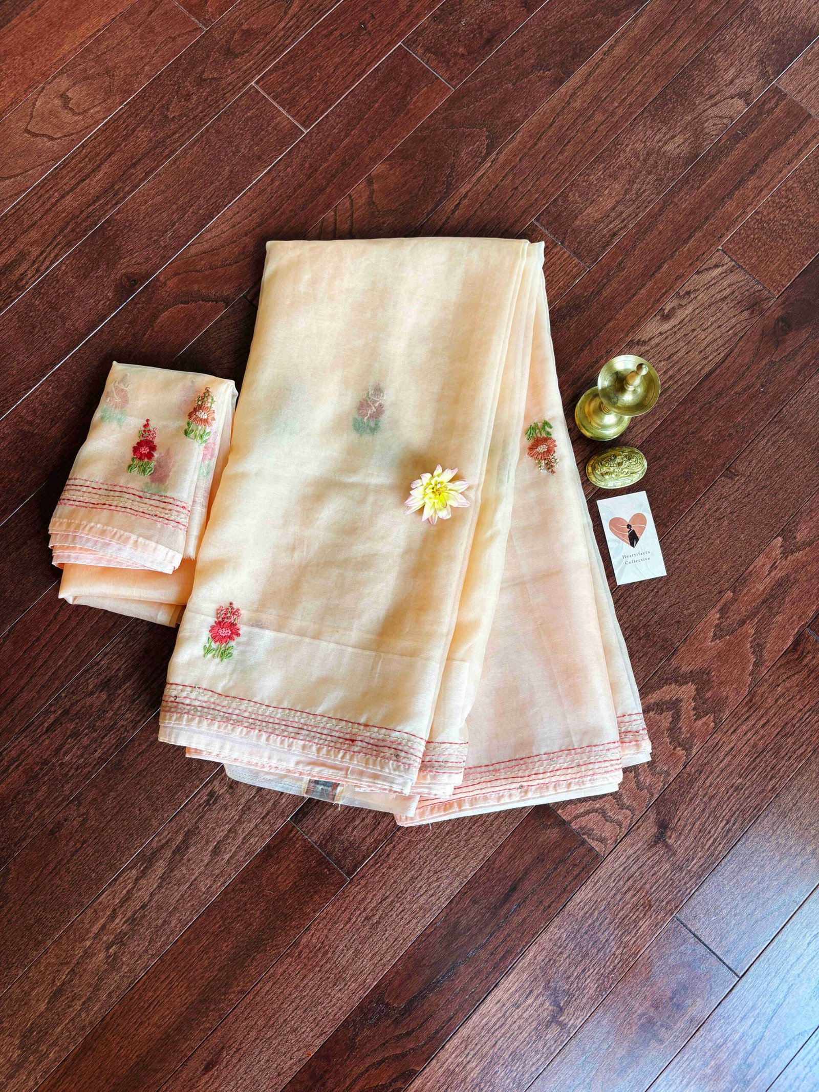 A peach organza saree sporting floral French Knot embroidery. This lightweight saree is a flawless blend of timeless elegance and modernity. It’s a real sunshine daydream that will have you checking twice to make sure it’s actually there. A real steal of a deal, this saree is proof that dreams and reality can cross paths.