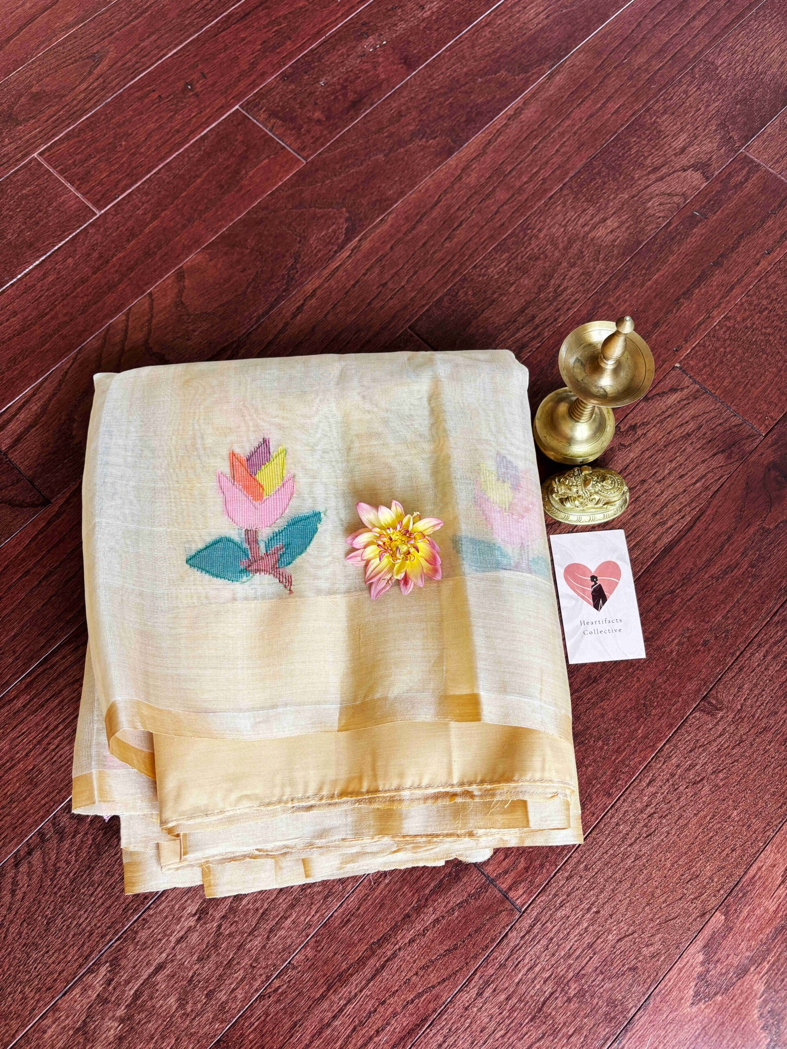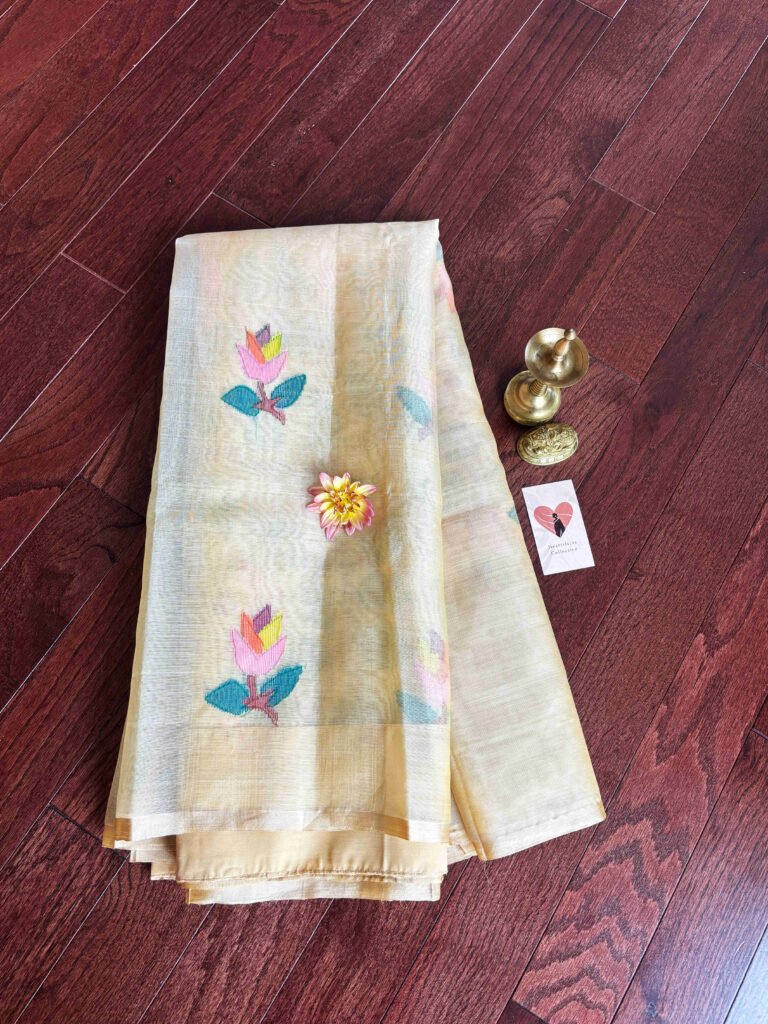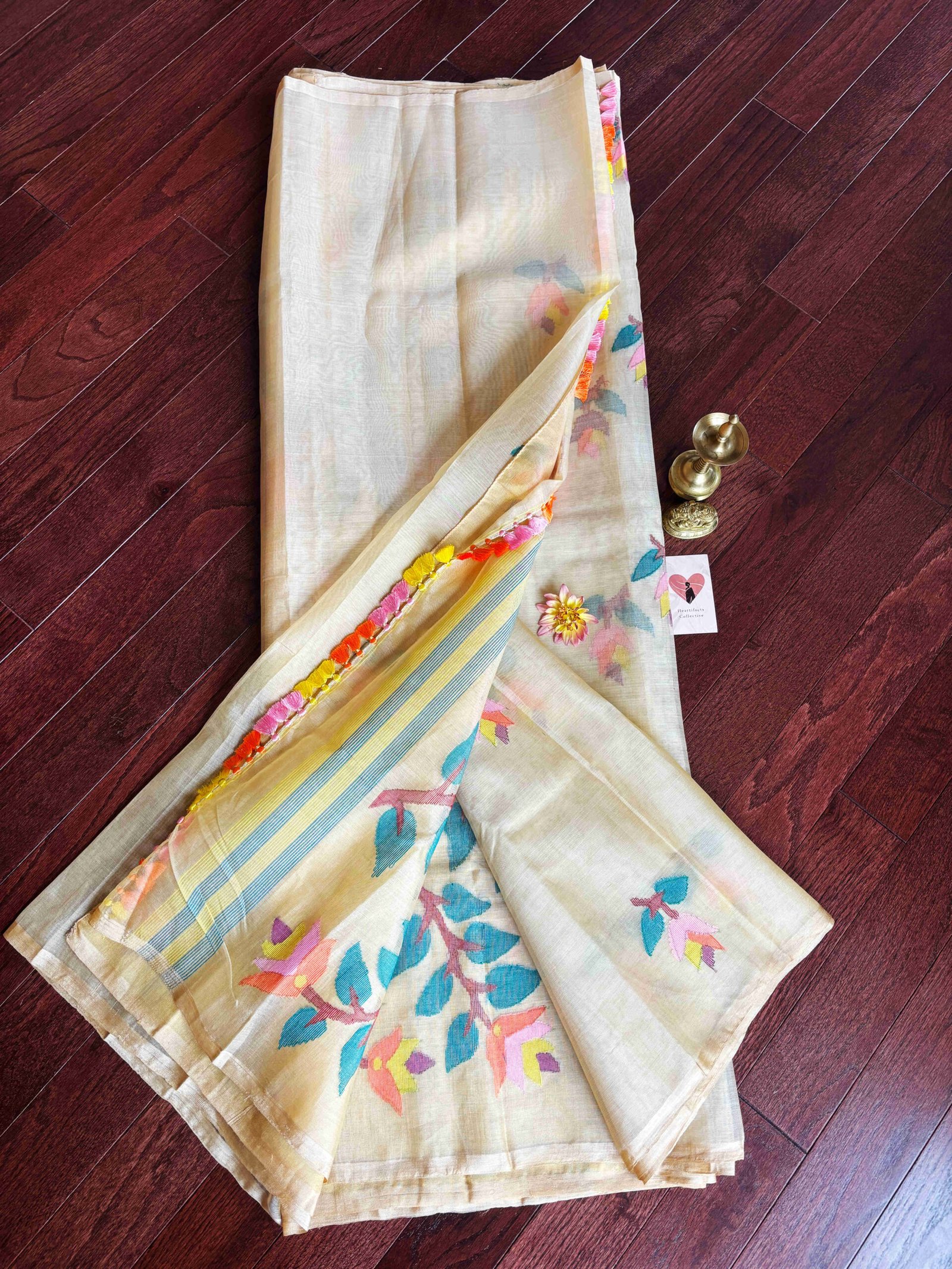 A handloom woven fabric that is known for its intricate designs, and lightweight texture. The origin of this beautiful saree can be traced back to the Mughal era. During the Mughal rule, it was considered a luxury fabric for the nobility. It actually originated in Dhaka, Bangladesh. The Jamdani weaving method is time-consuming and needs a high level of ability. It entails weaving elaborate designs directly onto the loom with no mechanical means. The weavers weave the floral designs into the fabric as they go, creating a seamless, stunning design. The process of weaving Jamdani results in a fabric that is incredibly lightweight and breathable, making it a perfect choice for everyday wear.