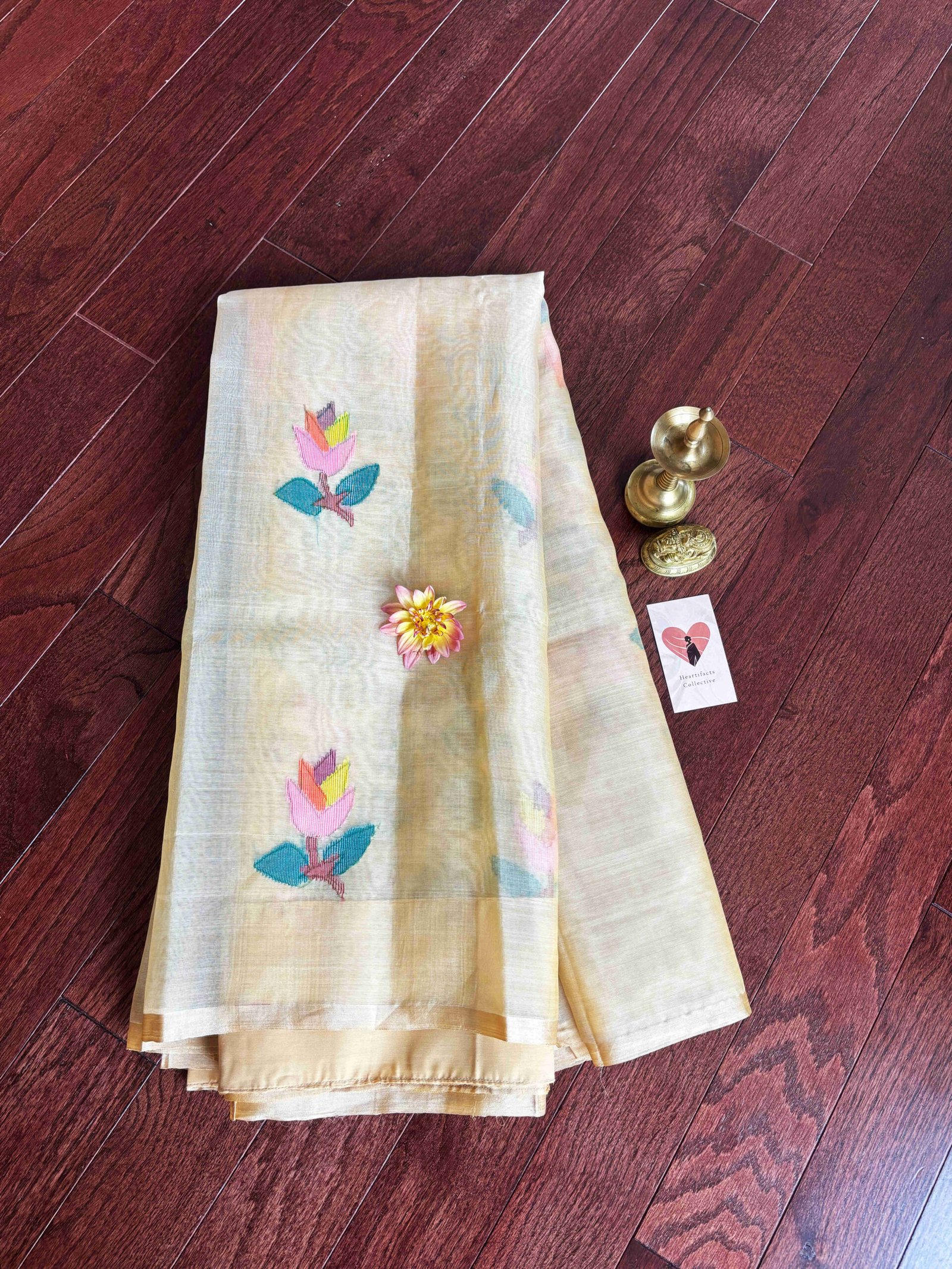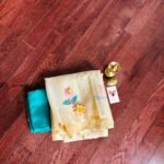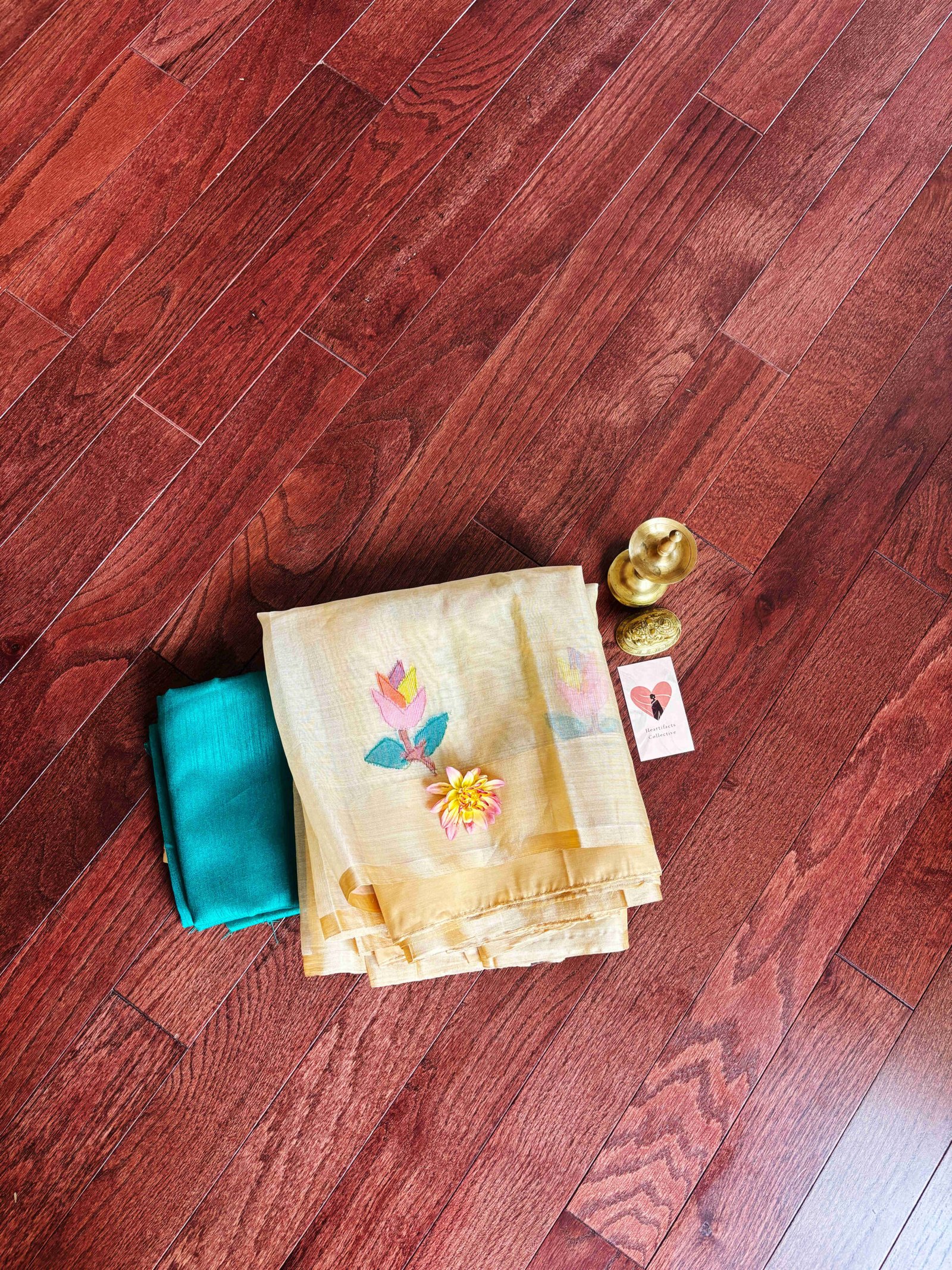 This handwoven masterpiece from Bengal has a gorgeous light sandalwood colour with intricate, colourful floral motifs. The turquoise blouse ties everything together perfectly. A surprisingly lightweight saree!