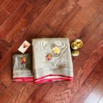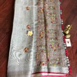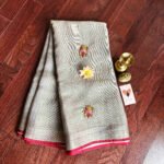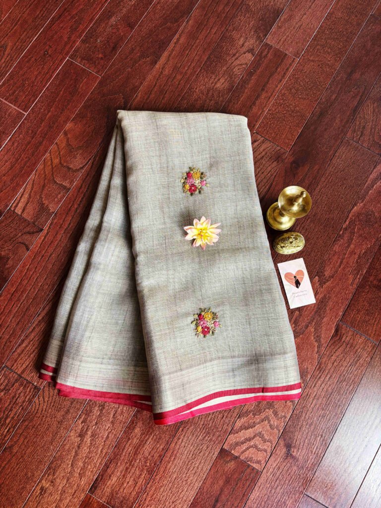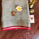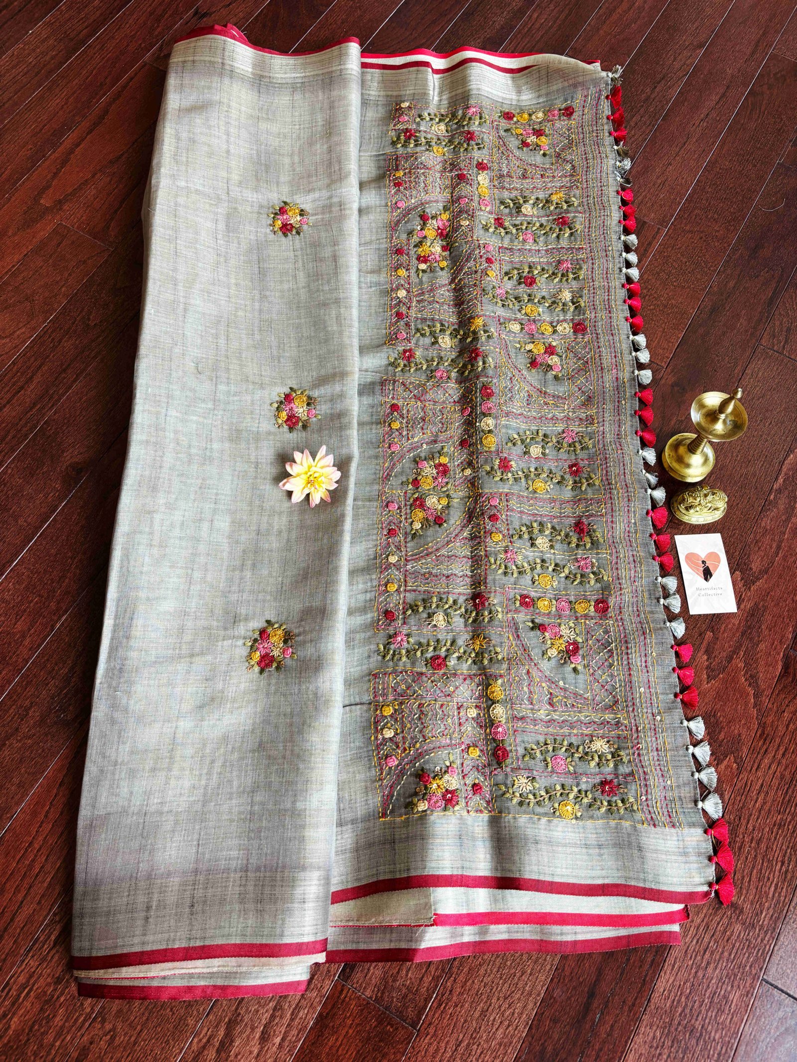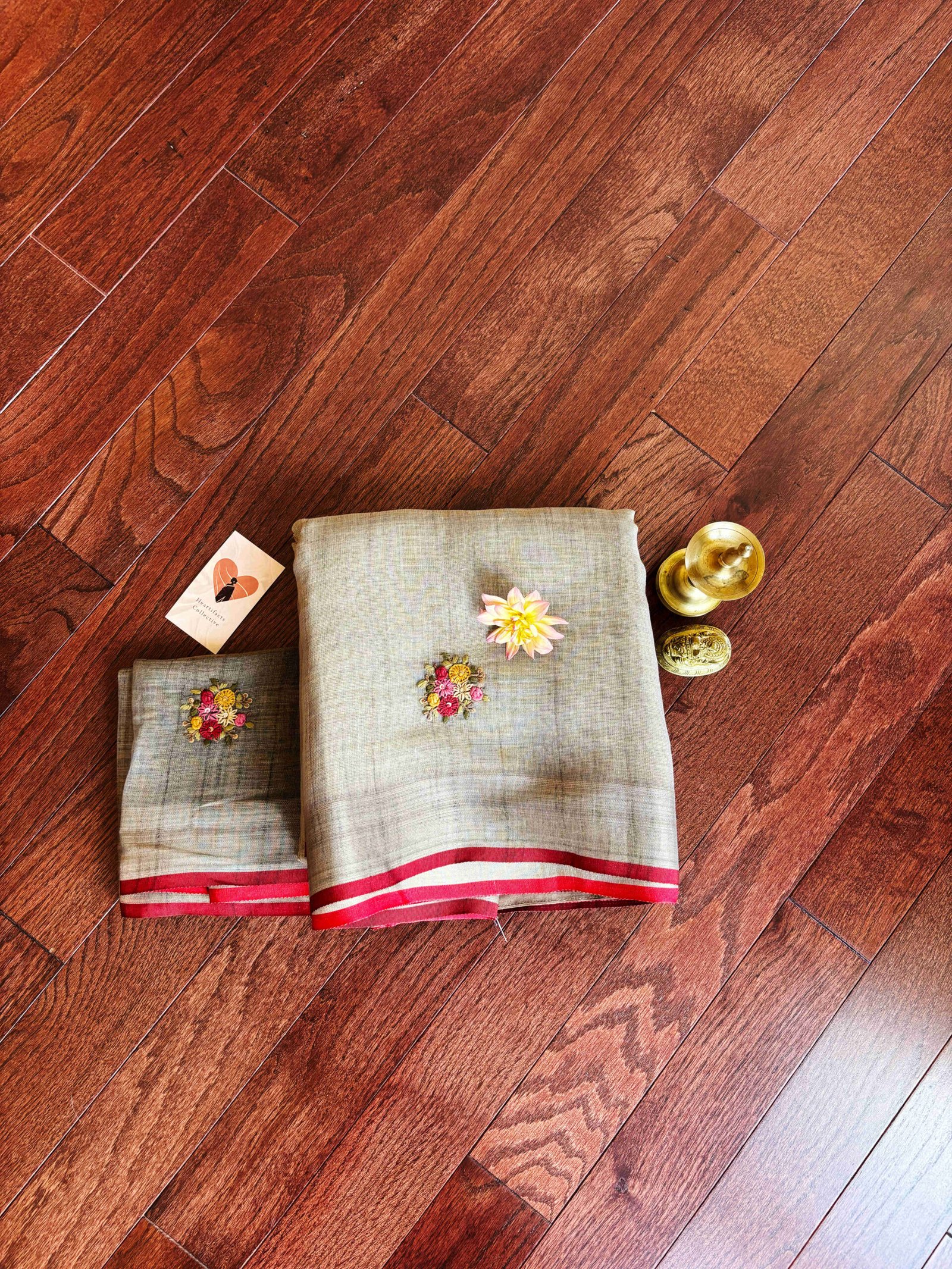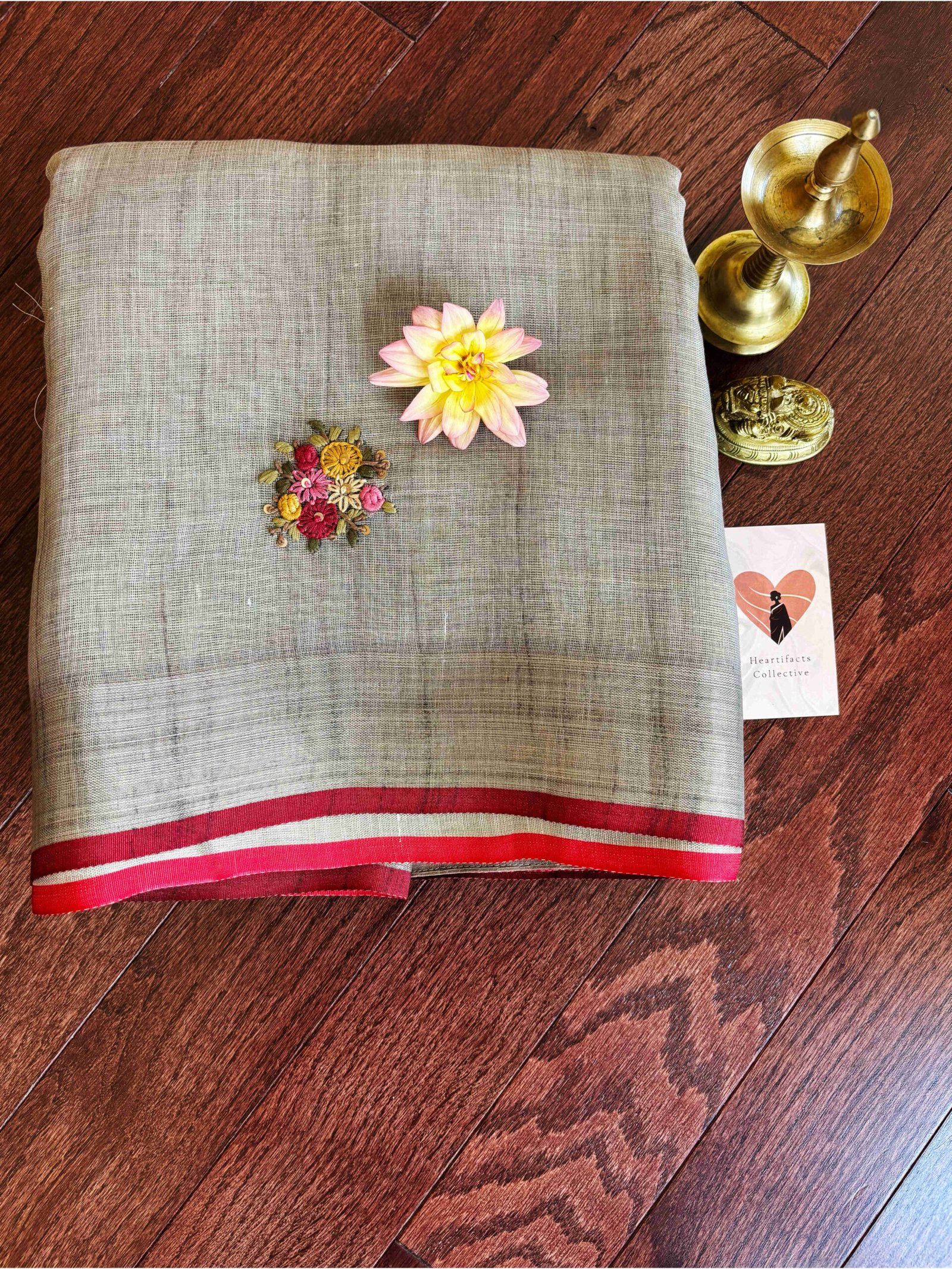 A beautiful beigish grey body in soft linen tissue silk. The body has a golden tone to it as well, and a dark red border with handwoven french knot embroidery on the pallu.