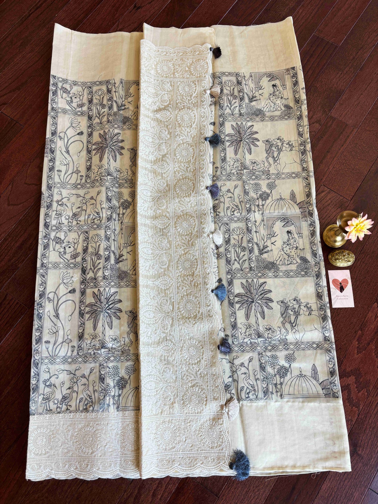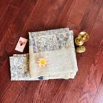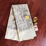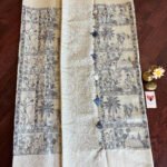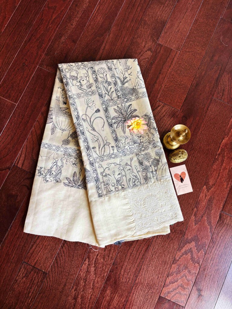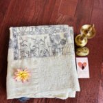 Super soft Tussar Silk. This ivory saree has beautiful pichwai animal prints all over it that come to life as the saree is draped. Again, an extremely soft saree that falls on the wearer like a waterfall.